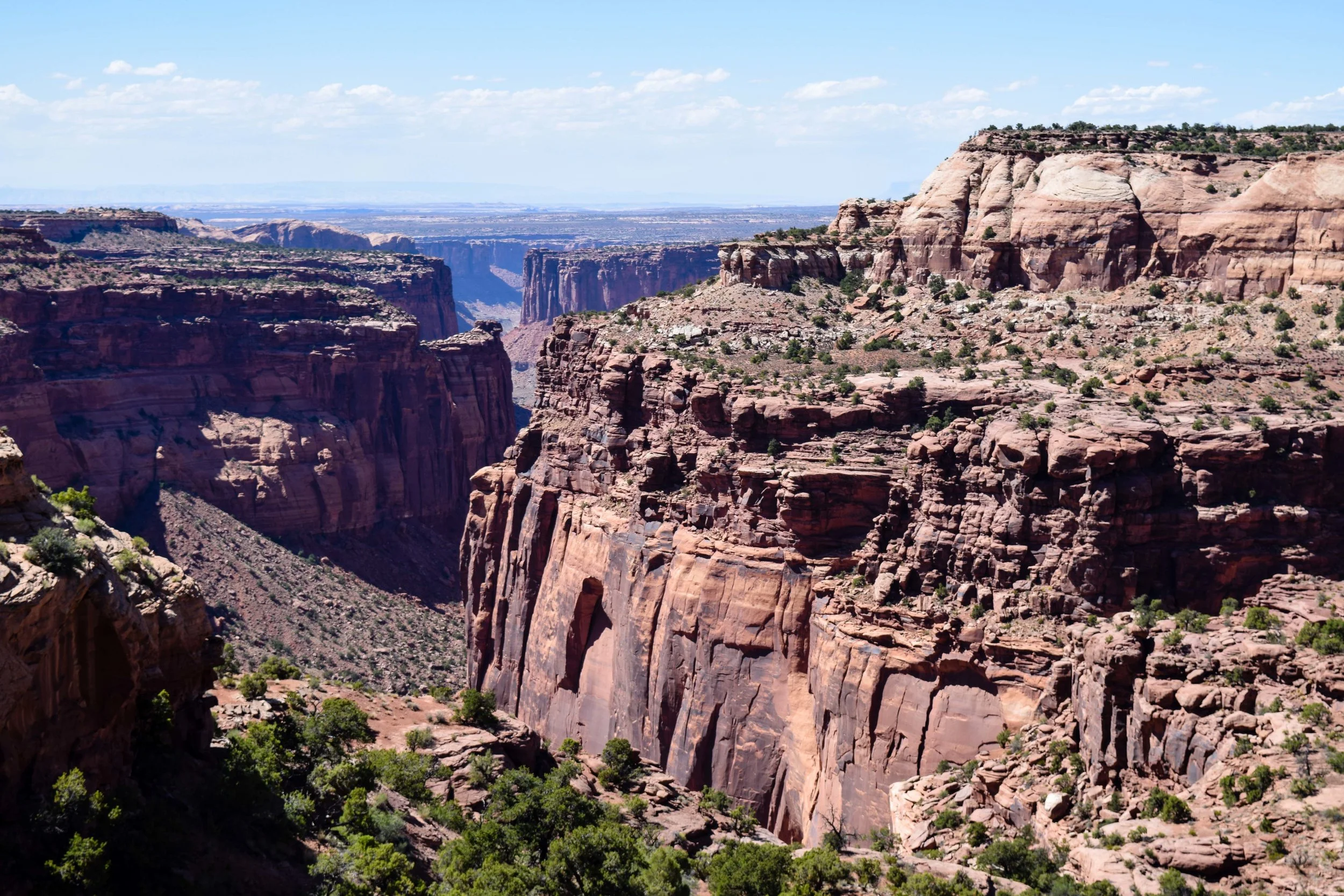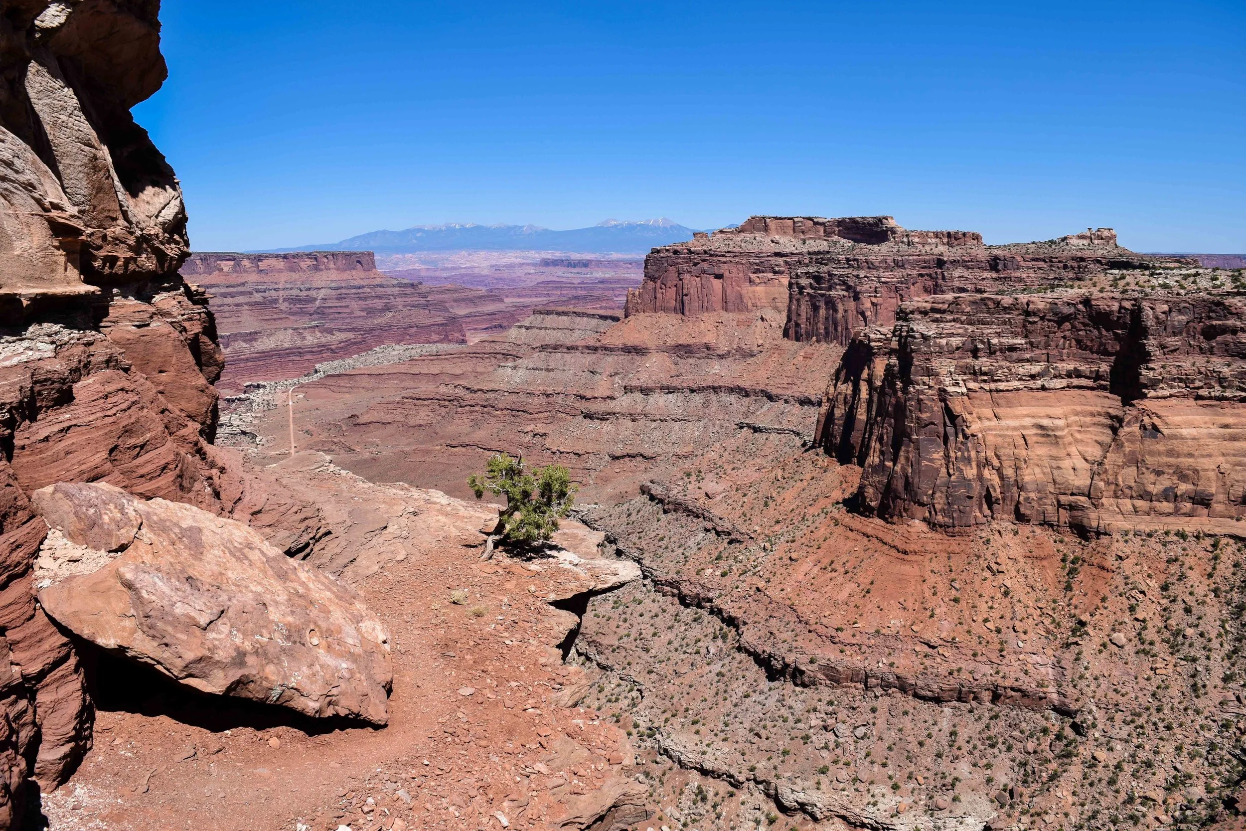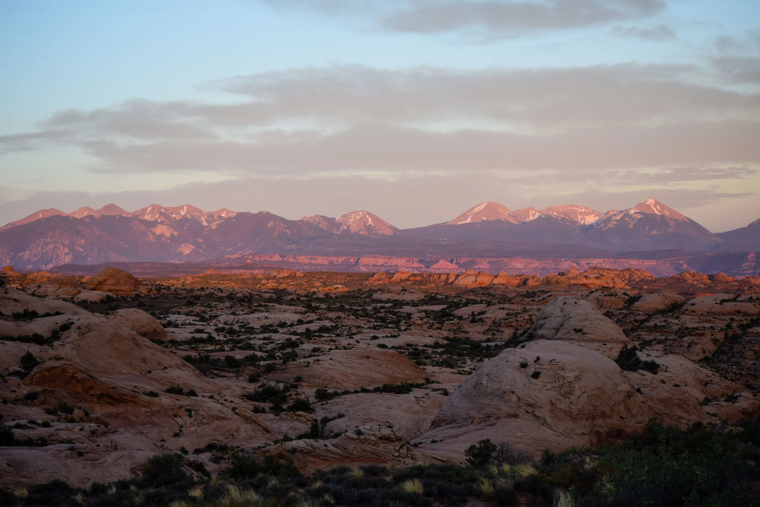 Later that night, I was surprised by an old friend, with the help of Thatcher, who spent the next few days with us finishing out our exploration of Utah. Aspen isn’t too far from Moab, after all. Aaron and Thatcher and I set out from the hostel the next morning and grabbed whatever we thought we would need for camping that night. Moab is known for its proximity to the outdoors and all the amazing things you can see and do there. Camping being one of them, we were definitely not going to miss out on a night under the stars. BLM land all along the route to Canyonlands National Park, we picked what looked like a good spot and laid out the tent. The wind was only just starting to pick up so we put some rocks on it and left it in our spot to hold it. Somehow, Aaron got his 4-wheel drive ’87 Land Cruiser, stuck in the sand, which we now know was due to a slight lapse in judgement by not putting it into a low gear and we spent I would say a solid hour and change trying to push him out of the sand prior to coming to that realization. We even had to get Bertha in on the action. Finally starting our day around three, we headed the fifteen minutes up the road to Canyonlands National Park. The part of the park we went to is called Island in the Sky and honestly, it’s the best way to describe it as well. From one of the viewpoints, it looks as though the ground has been slowly eroding over time exposing canyons underneath the top layer. The colors were exceptional; reds, oranges, yellows, even greens and purples were present. An area which is still a mystery, Upheaval Dome, boasts purple cliffs and mint green and brown cracking rocks below. Fun fact, no one knows how it came to be. The two theories are either it was a salt dome that cracked and tilted the rock over time, or a violent meteor impact that instantly fractured the rock. Either way, it is a truly unique sight, as all the Utah parks seem to be. Wind having picked up exceptionally, we spent the night cooking over the fire, eating delicious and slightly sandy food, and watching yet another vibrant sunset. I chose this time not to take any photos and just admire from afar, content in that moment and in excellent company.